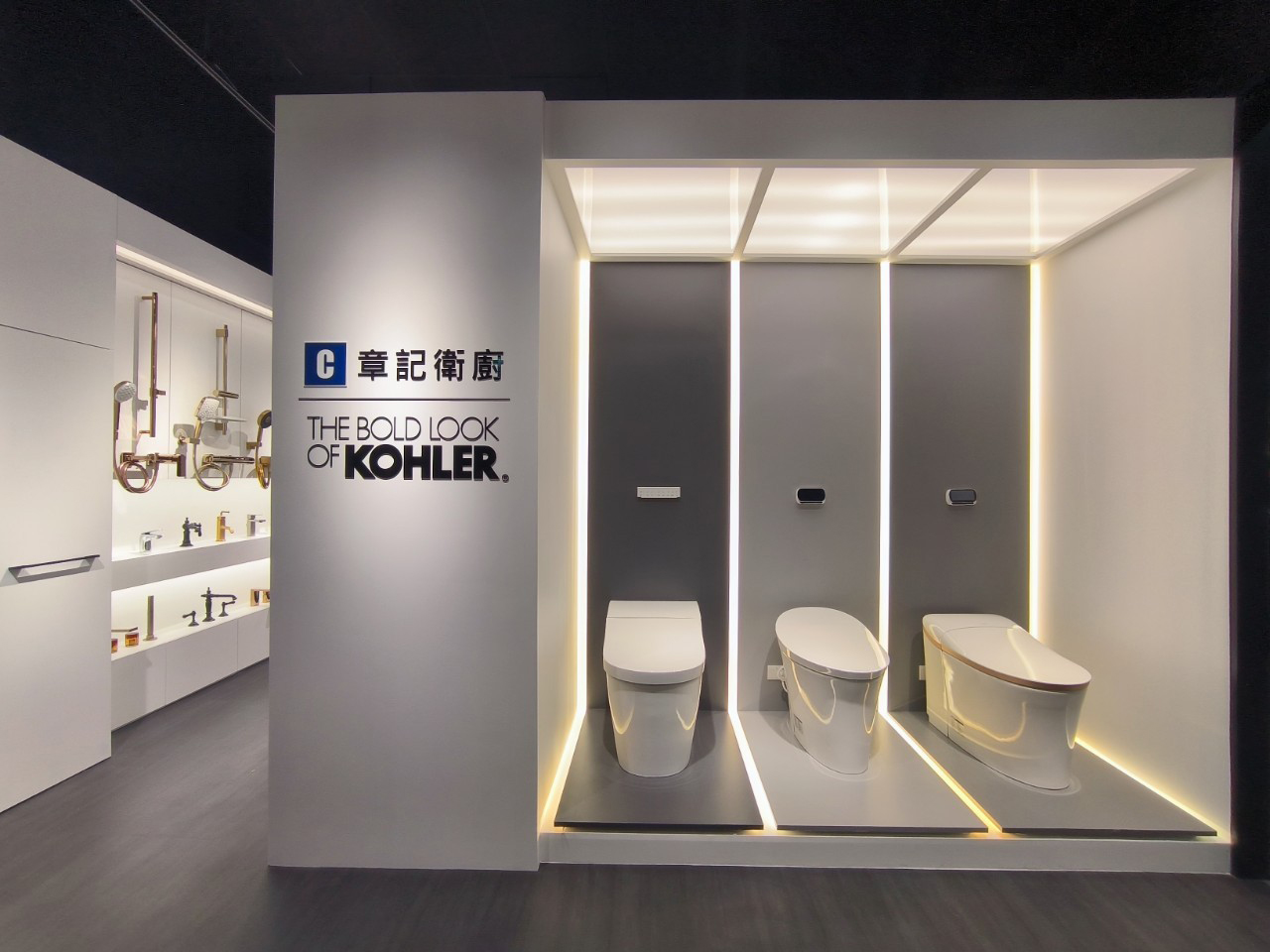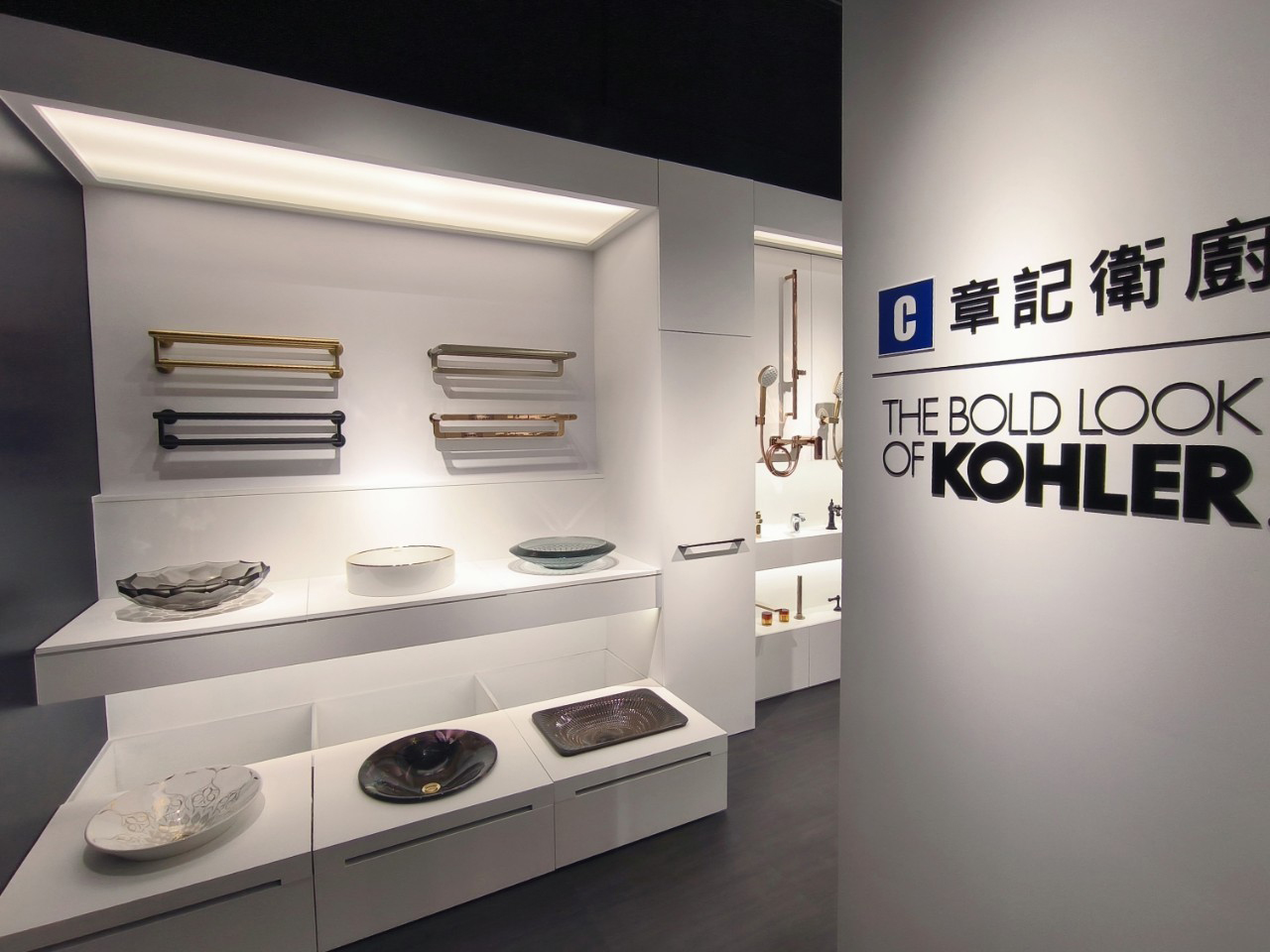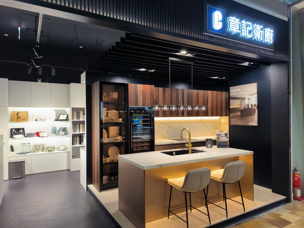 櫃位展示了美國百年廚衛經典品牌KOHLER的最新商品,包含莊園風格的開放式廚房,以及各品牌的衛浴設備和廚房家電。現在就來章記衛廚,規劃您的夢想廚房和五星級衛浴吧!