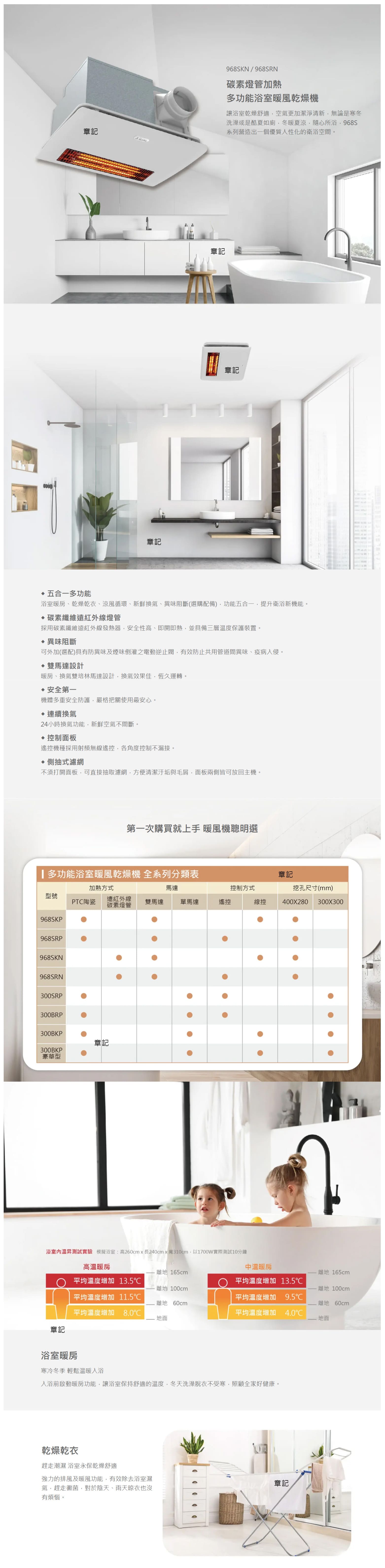 美學與機能的全新進化,以近乎苛求的嚴謹製程,用心呵護每一個工作細節。科技人性化的優異設計,讓968系列的浴室暖風乾燥機擁有一機多享受的功能,無論是在酷夏或寒冬,都讓您的浴室更舒適清爽,營造出一個優質人性化的衛浴空間。