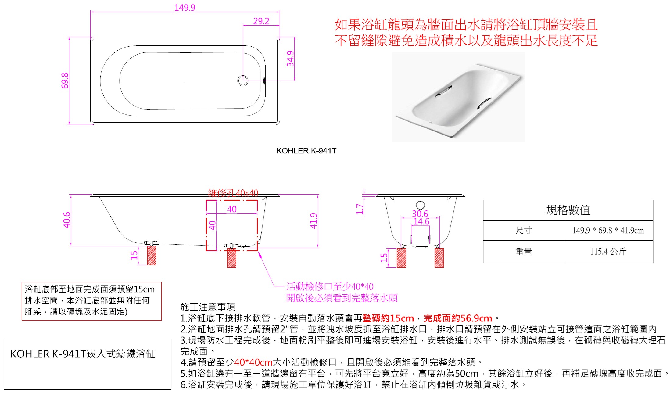 KOHLER Soissons 鑄鐵浴缸 K-941T-GR-0 尺寸圖
