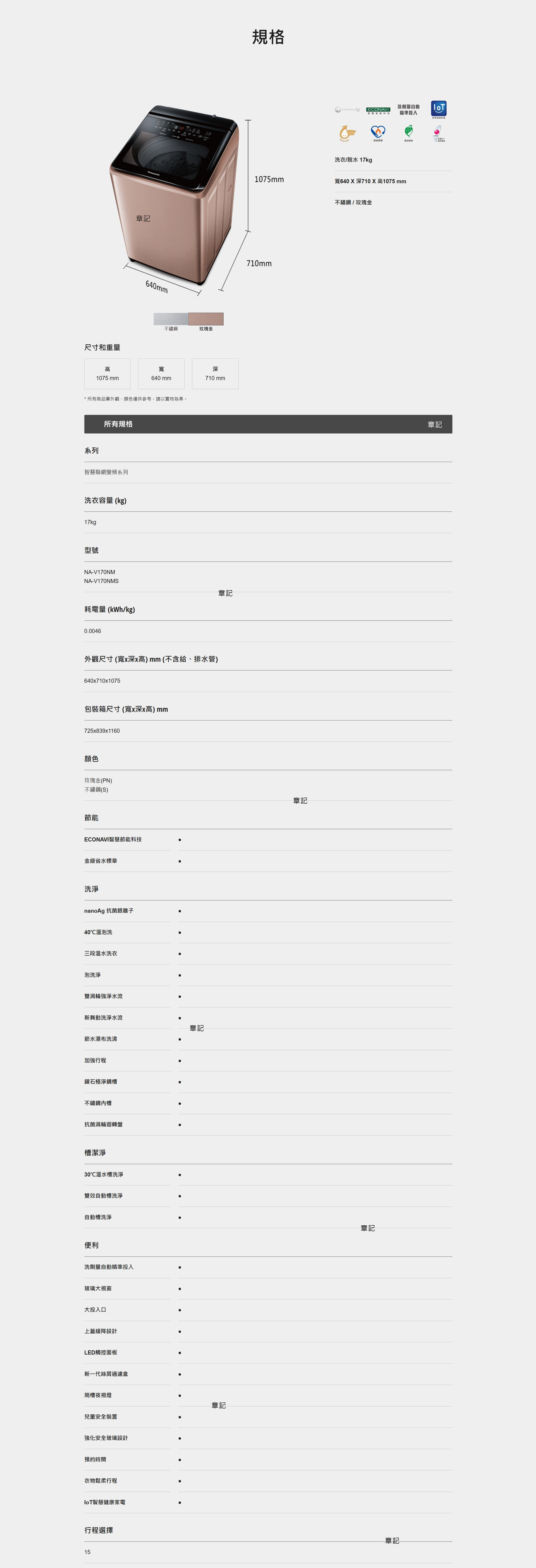 Panasonic 智慧聯網變頻直立溫水洗衣機(玫瑰金) NA-V170NM-PN 尺寸圖