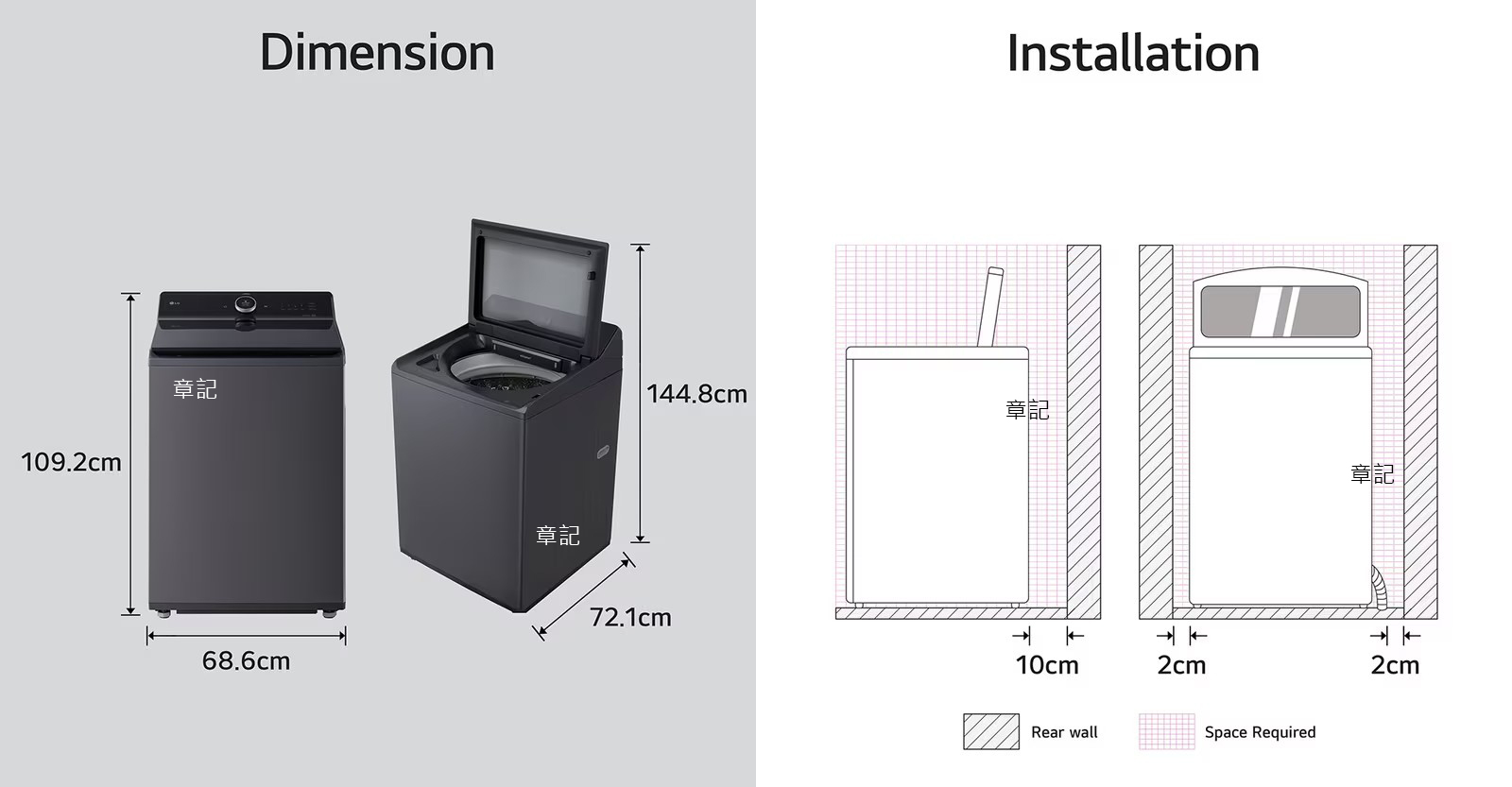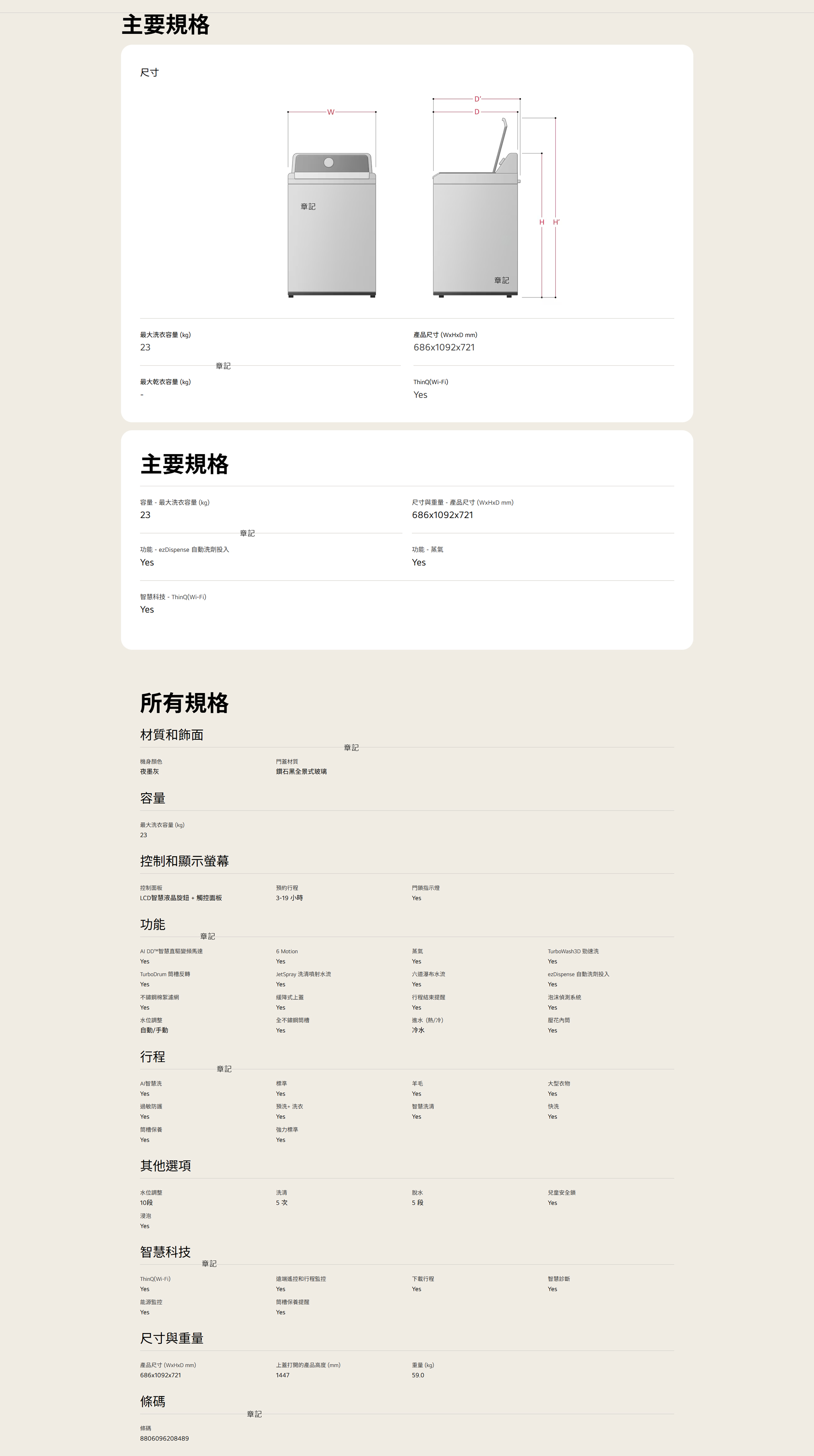 LG AI DD 直立式洗衣機 WT-TD23HG 尺寸圖