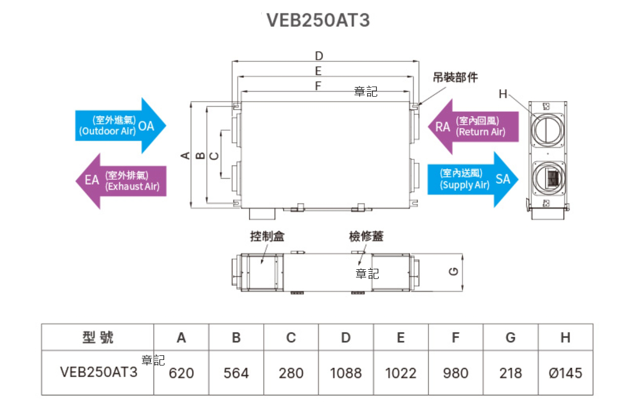 台達(DELTA)直流變頻全熱交換器 VEB250AT3 尺寸圖