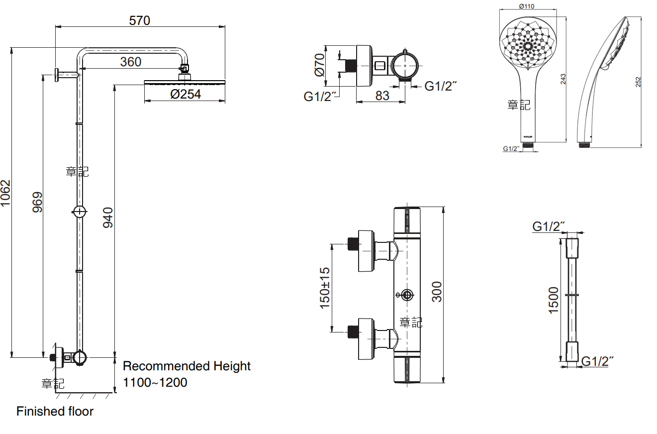 KOHLER Atom 雙出水淋浴柱 K-30023T-7-CP 尺寸圖