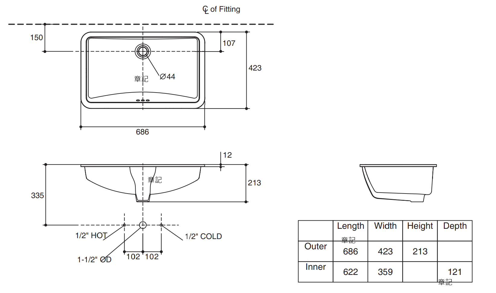 KOHLER Ladena 下嵌檯面盆 K-76509K-0 尺寸圖