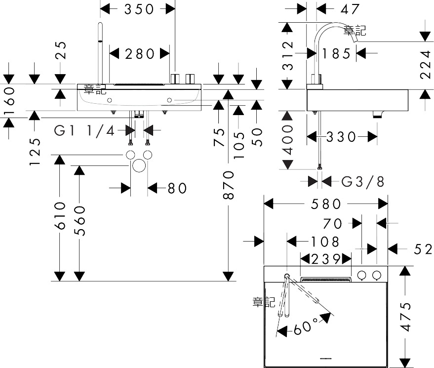 面盆外部尺寸: 580x475x100 mm (寬x深x高)
