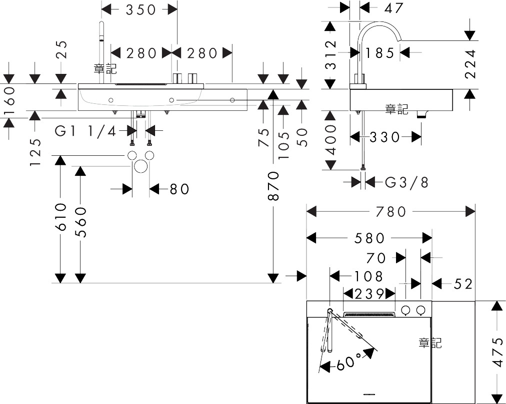 面盆外部尺寸: 780x475x100 mm (寬x深x高)