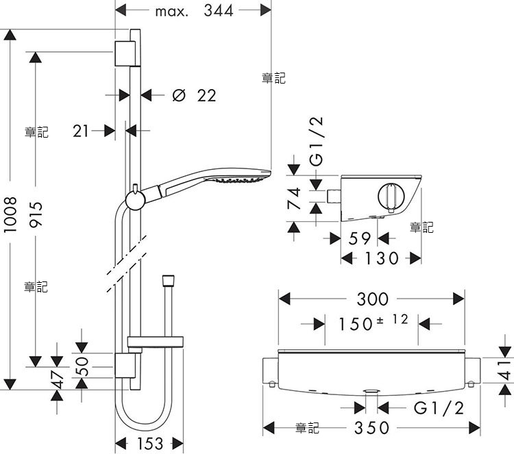 hansgrohe Raindance Select S 淋浴龍頭附滑桿組 27037 尺寸圖