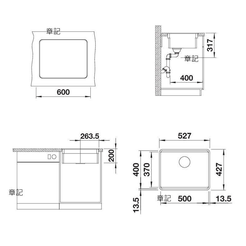BLANCO ETAGON 500-F 花崗岩水槽(52.7x42.7cm) 527257 尺寸圖
