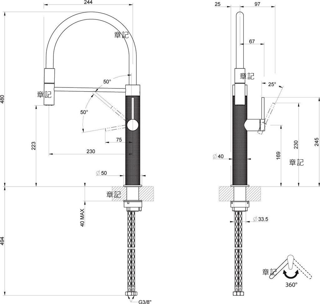 GESSI 316 不鏽鋼圓形刻紋單槍龍頭 60014 尺寸圖
