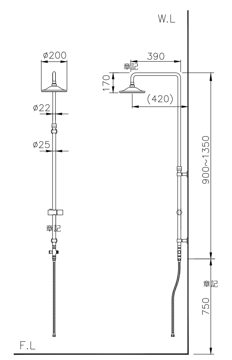 電光牌(TENCO)加裝型花灑柱 A-3083 尺寸圖