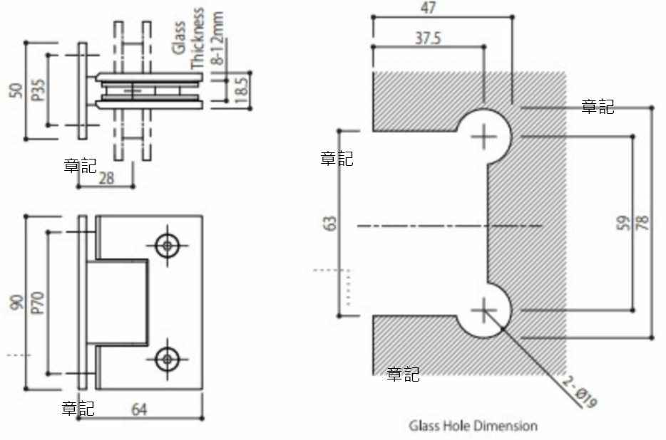 KAWAJUN 淋浴門鉸鏈(亮面金) AC-060-P01 尺寸圖