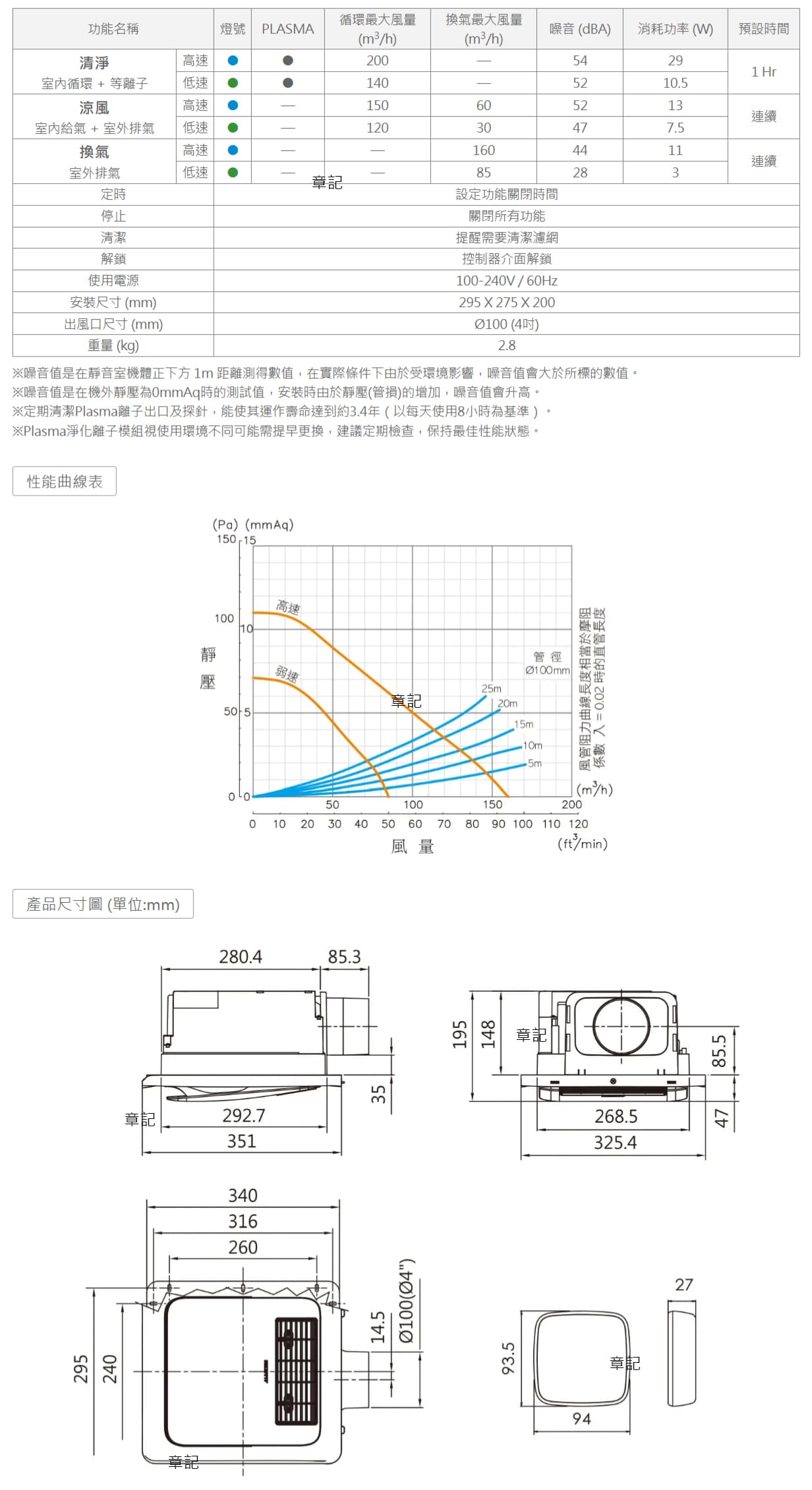 出風口尺寸:Ø100 mm (4吋)