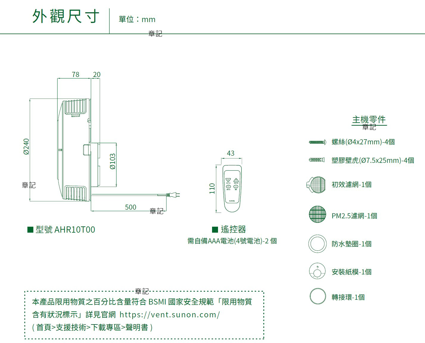 SUNON 雙流新風機(進風型) AHR10T00 尺寸圖