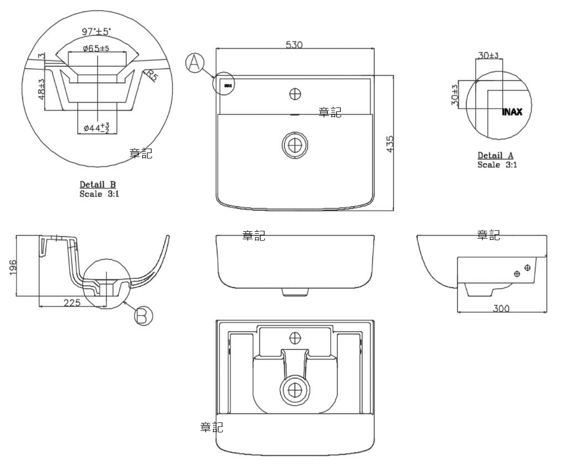 INAX 半嵌式臉盆(55cm) AL-345VFC-TW 尺寸圖
