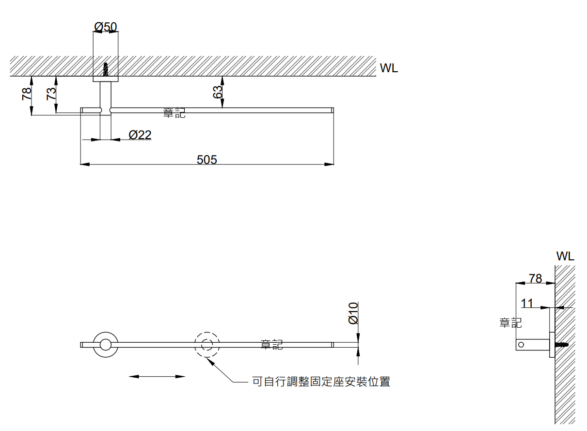 OVO 不對稱單桿毛巾架 AS8011 尺寸圖