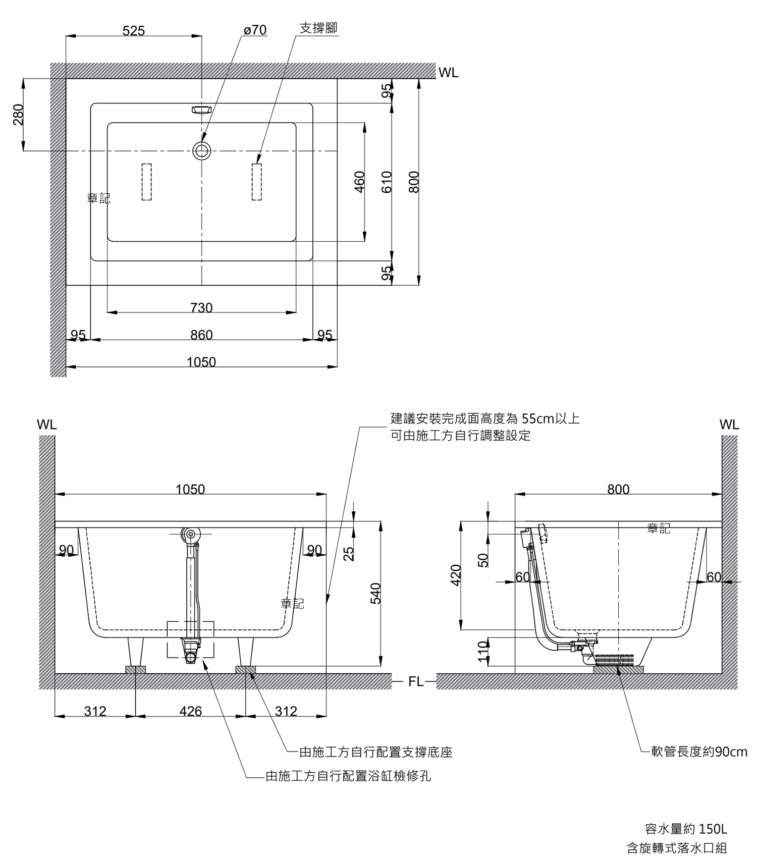 OVO 砌牆式空缸(105cm) BH116 尺寸圖