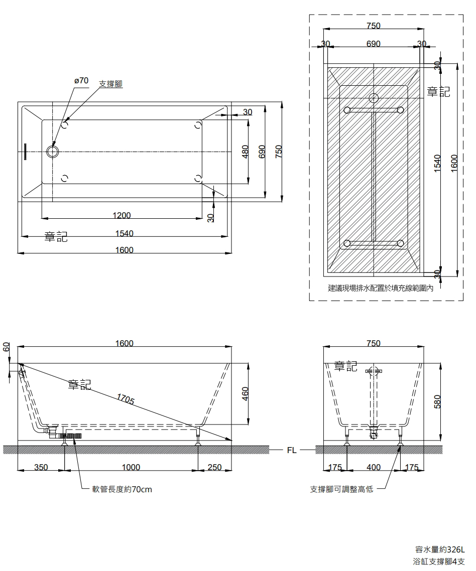OVO 獨立浴缸(160cm) BK103F 尺寸圖