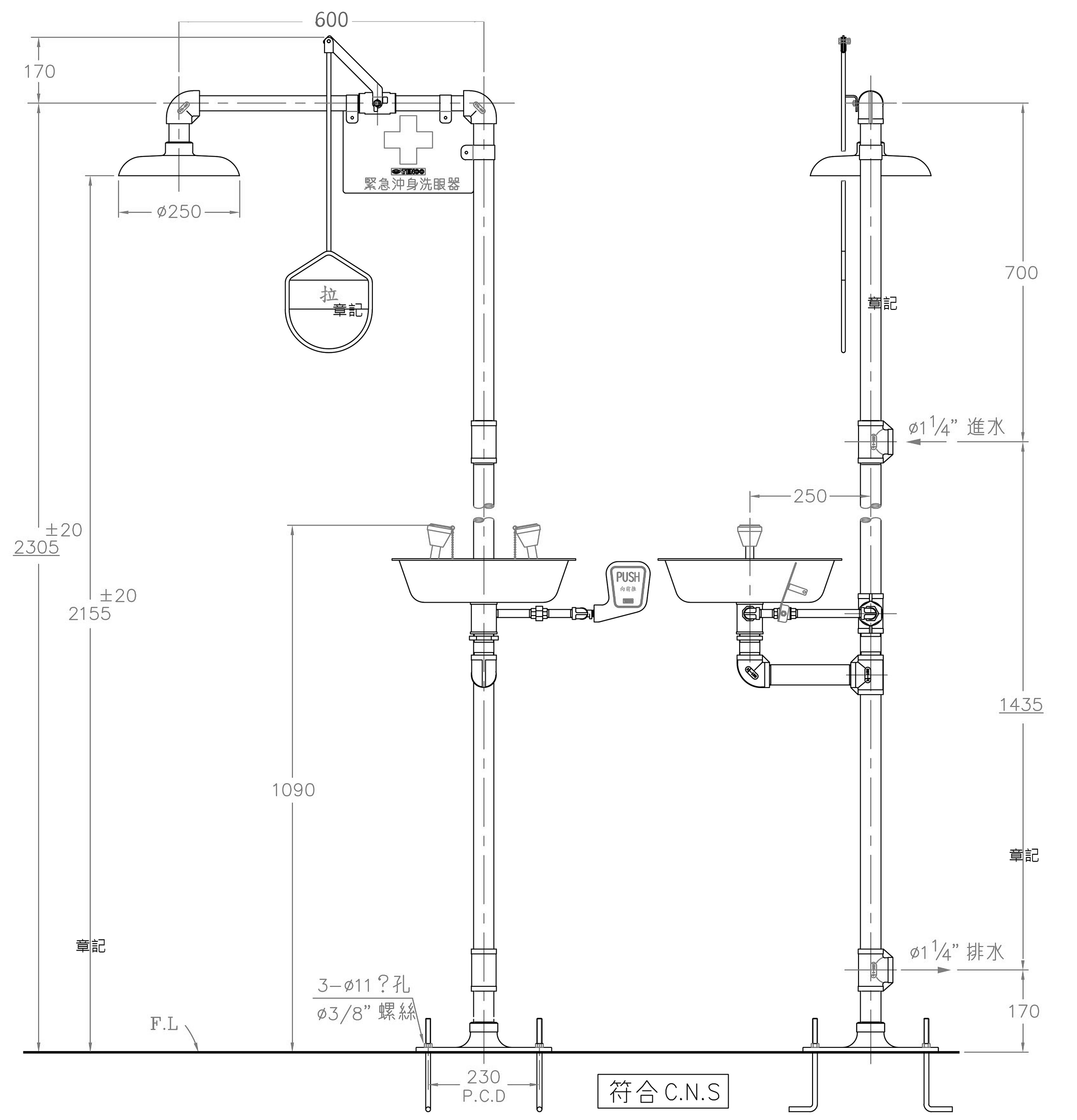 電光牌(TENCO)緊急沖身洗眼器 1¼" - 手拉式 C-206BS 尺寸圖