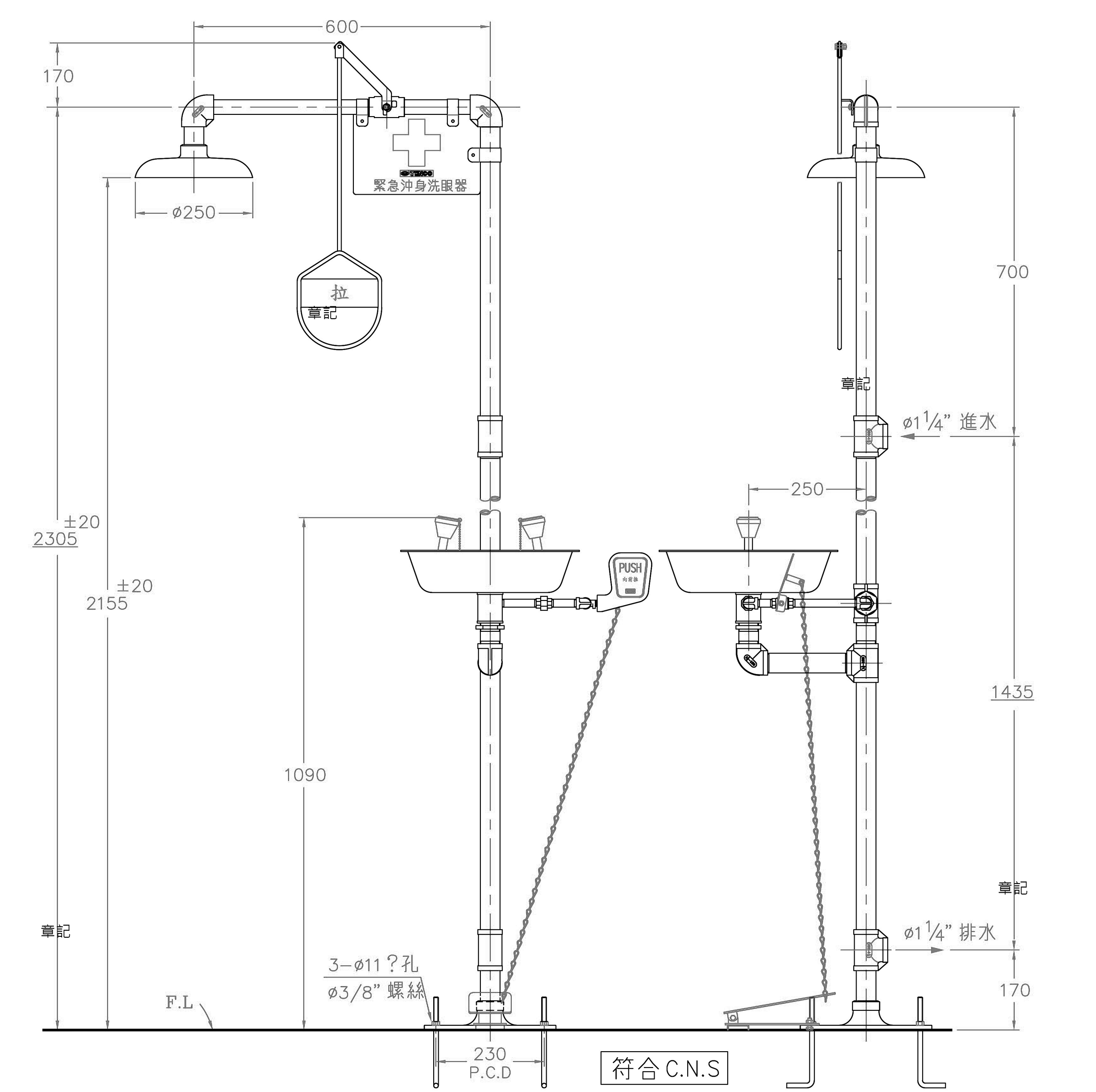 電光牌(TENCO)緊急沖身洗眼器 1¼" - 腳踏及手拉式 C-206CS 尺寸圖