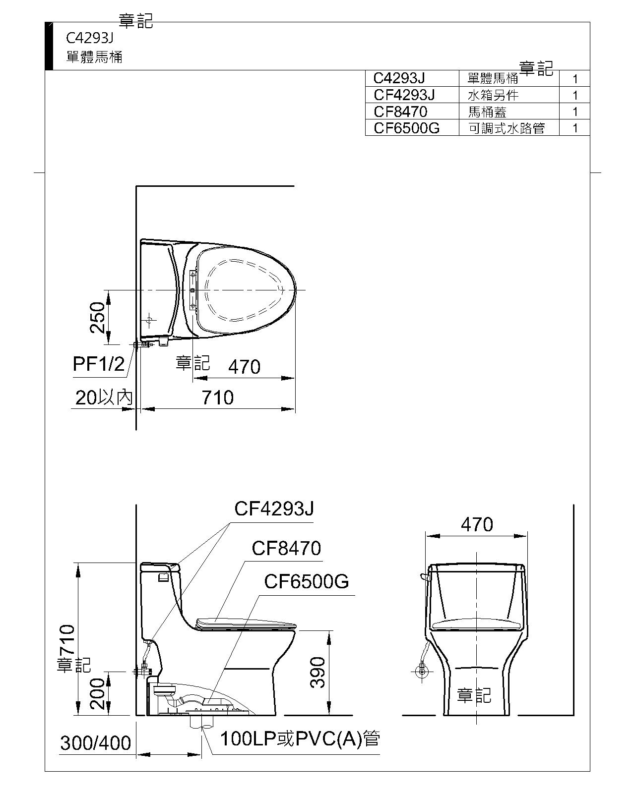 和成牌(HCG)單體馬桶 C4293J 尺寸圖
