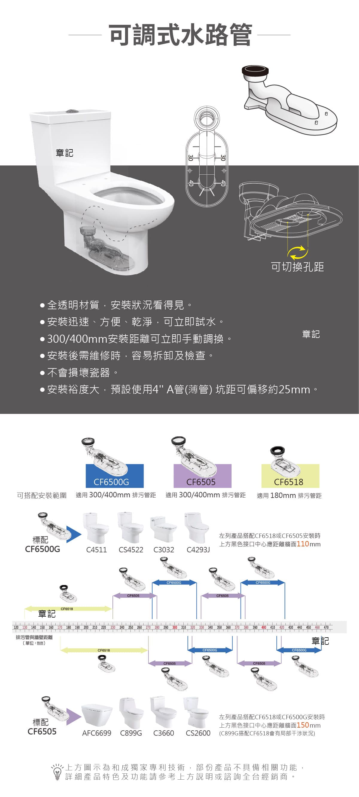 管距:180 / 300 / 400mm(可調式水路管)