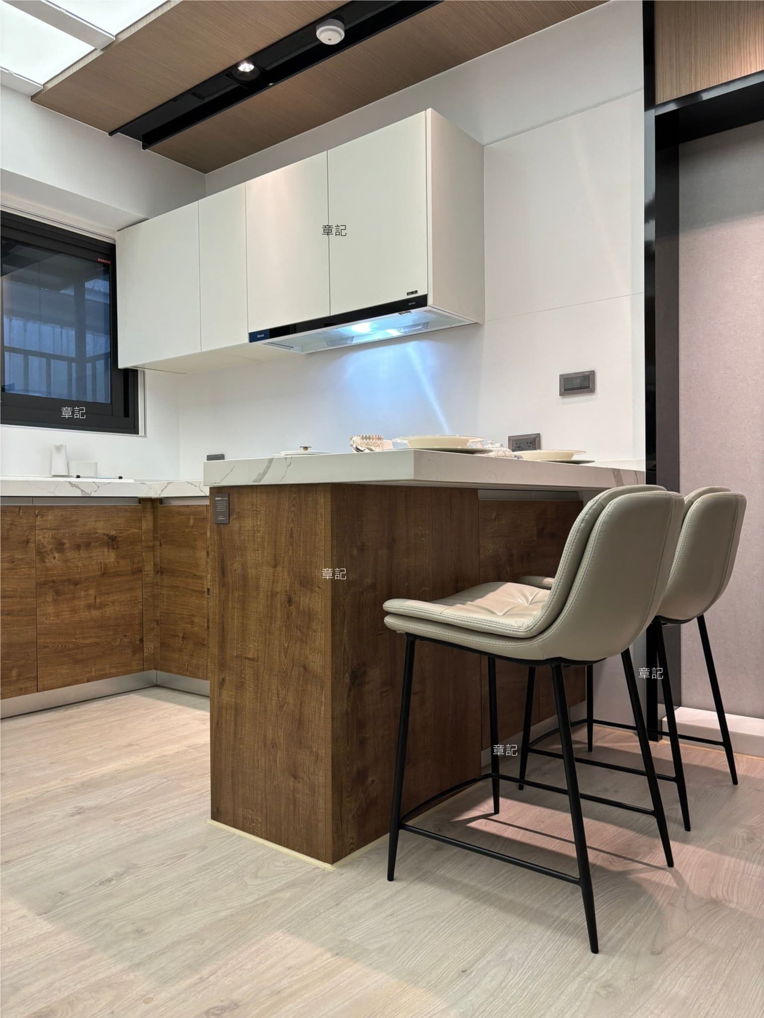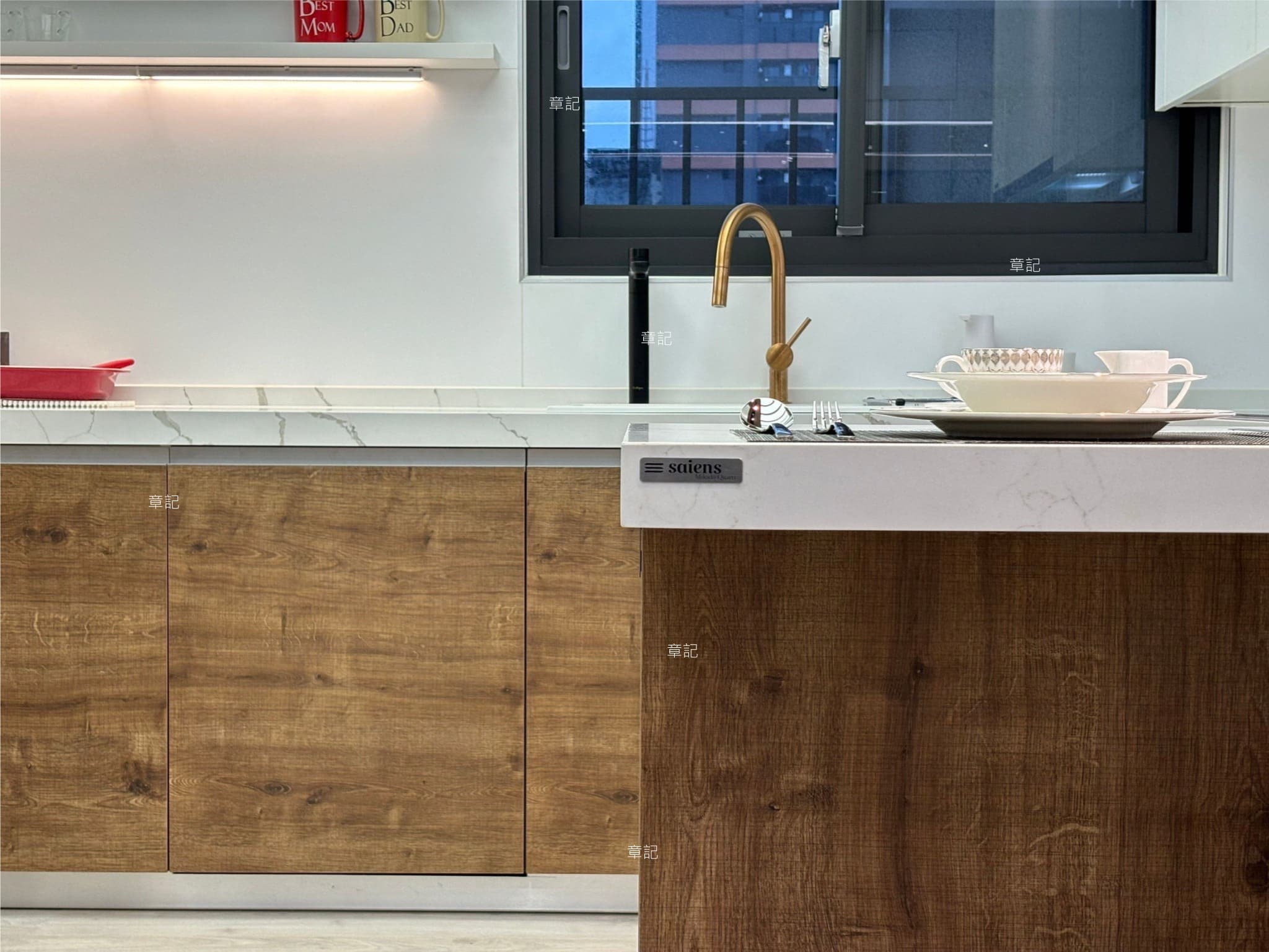 ㄇ字形動線設計,加上高身櫃、開放式層架及多款高階的廚房家電,讓設計美感之外更添實用機能。