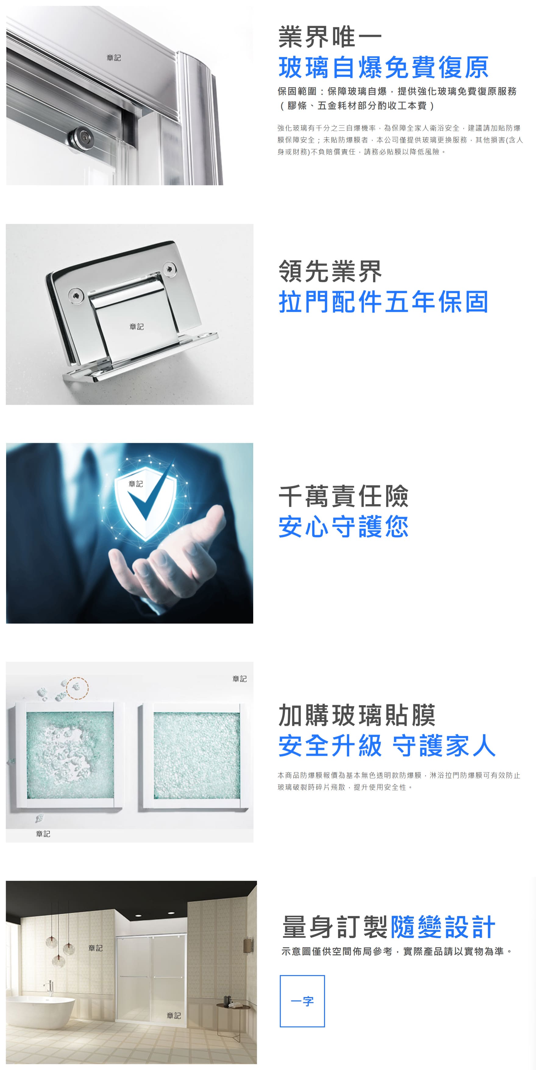5. 圖片皆為整體情境展示,本售價僅含淋浴拉門,不包括其輔助展示商品(沐浴龍頭、花灑柱、裝飾品等)。