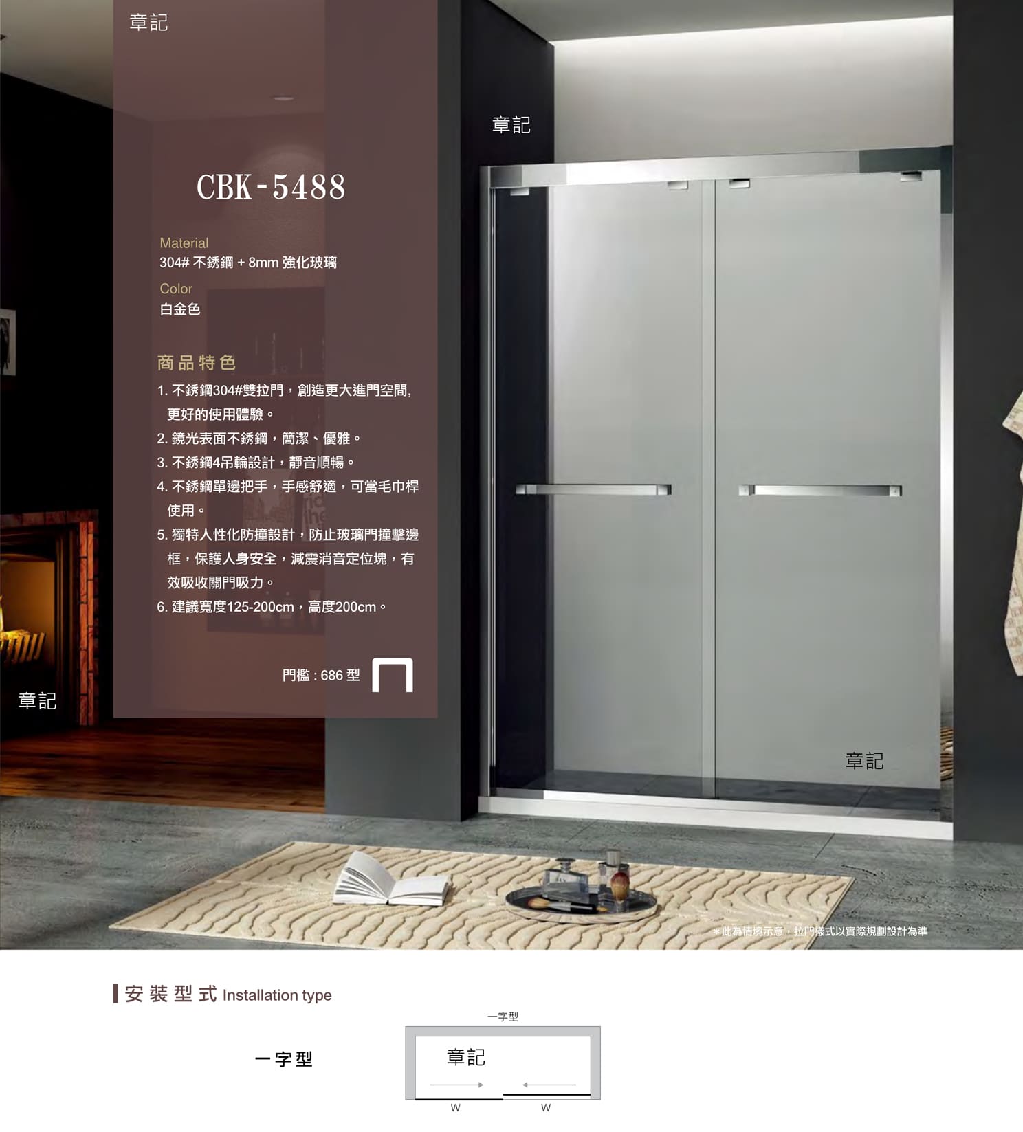 5. 圖片皆為整體情境展示,本售價僅含淋浴拉門,不包括其輔助展示商品(沐浴龍頭、花灑柱、裝飾品等)。