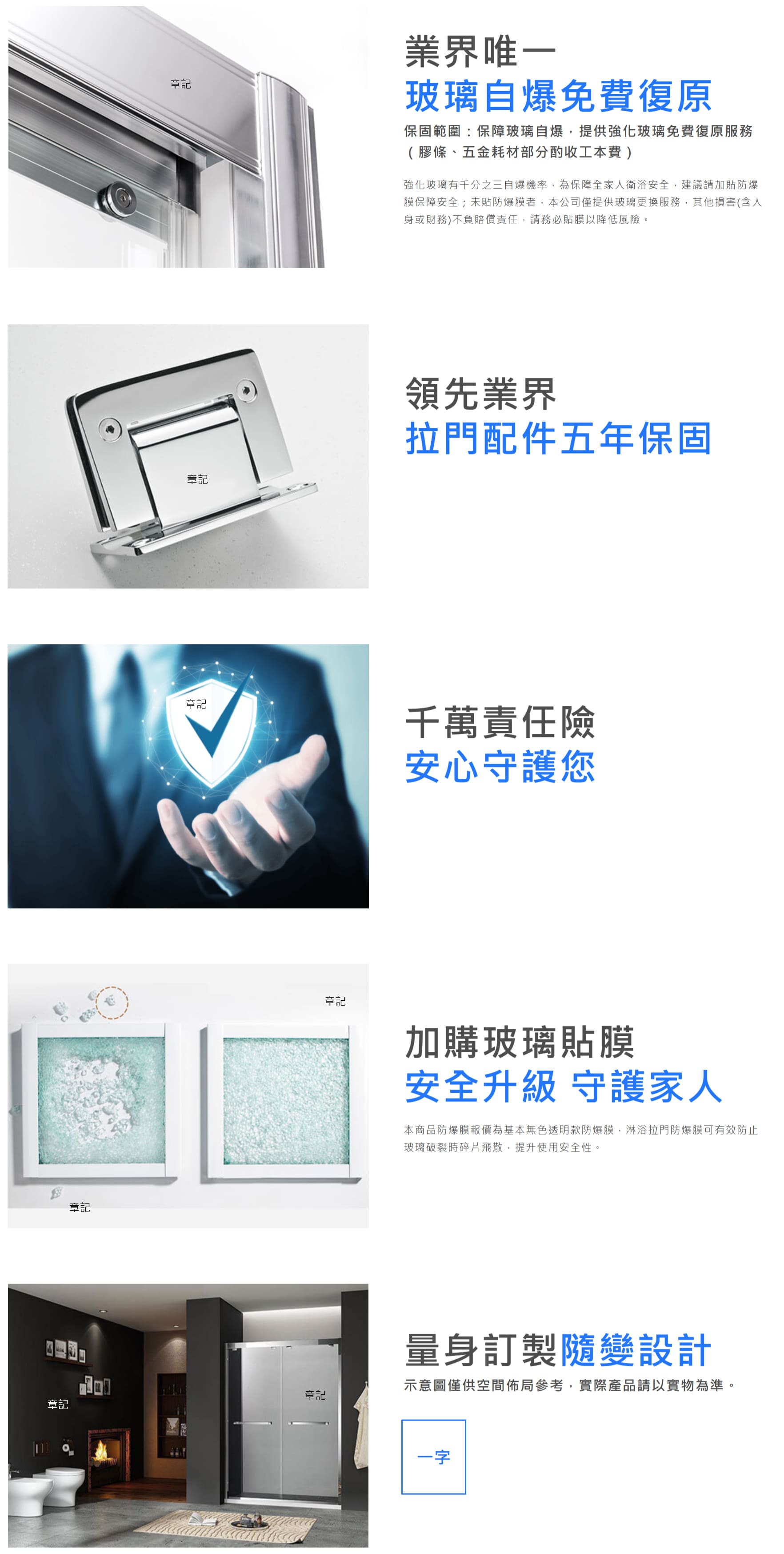 13. 玻璃產品具備一定比例之自然自爆風險(約千分之三),如發生此情形,本公司僅提供玻璃更換服務,其他損害(含人身或財務)不負賠償責任。