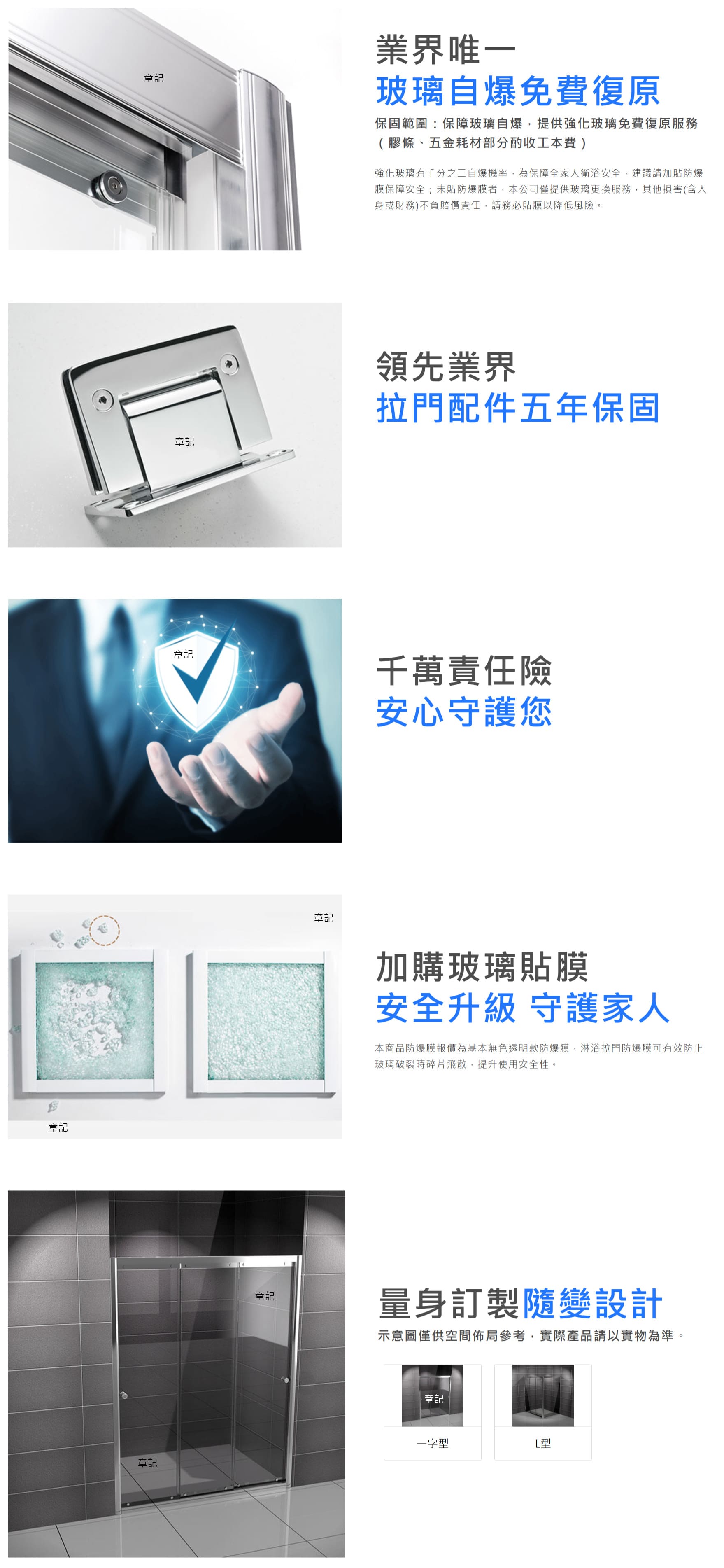 13. 玻璃產品具備一定比例之自然自爆風險(約千分之三),如發生此情形,本公司僅提供玻璃更換服務,其他損害(含人身或財務)不負賠償責任。