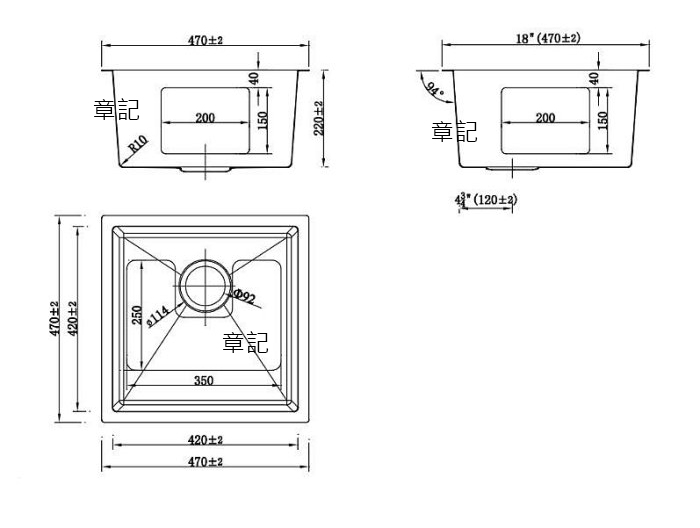 CBK 不鏽鋼手工水槽(47x47cm) CBK474722 尺寸圖