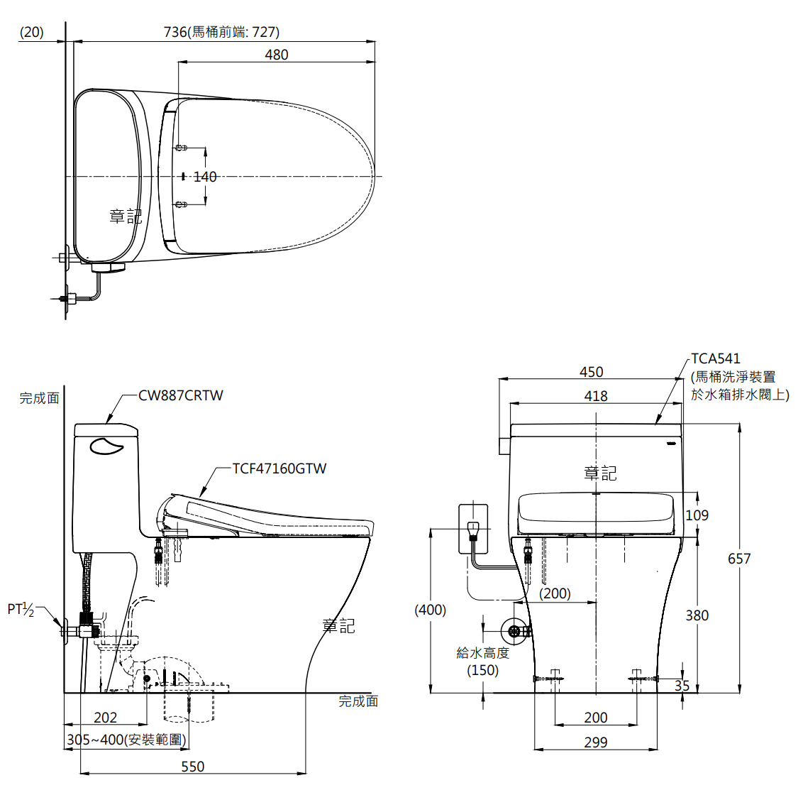 TOTO 除菌全自動馬桶 CCW887S7NA 尺寸圖