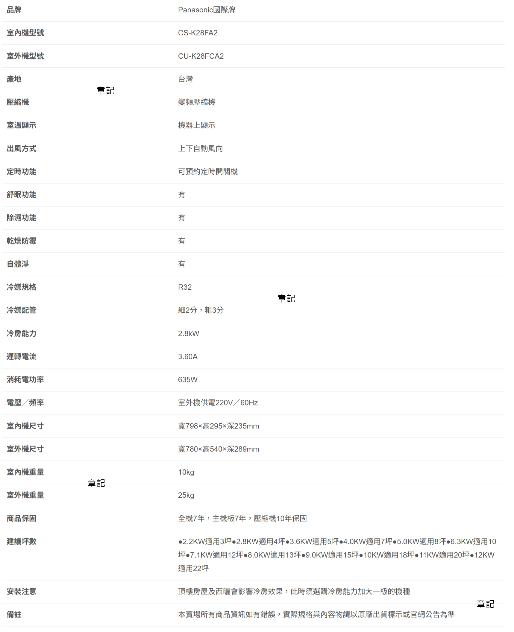 Panasonic K系列變頻冷專分離式冷氣 CS-K28FA2_CU-K28FCA2