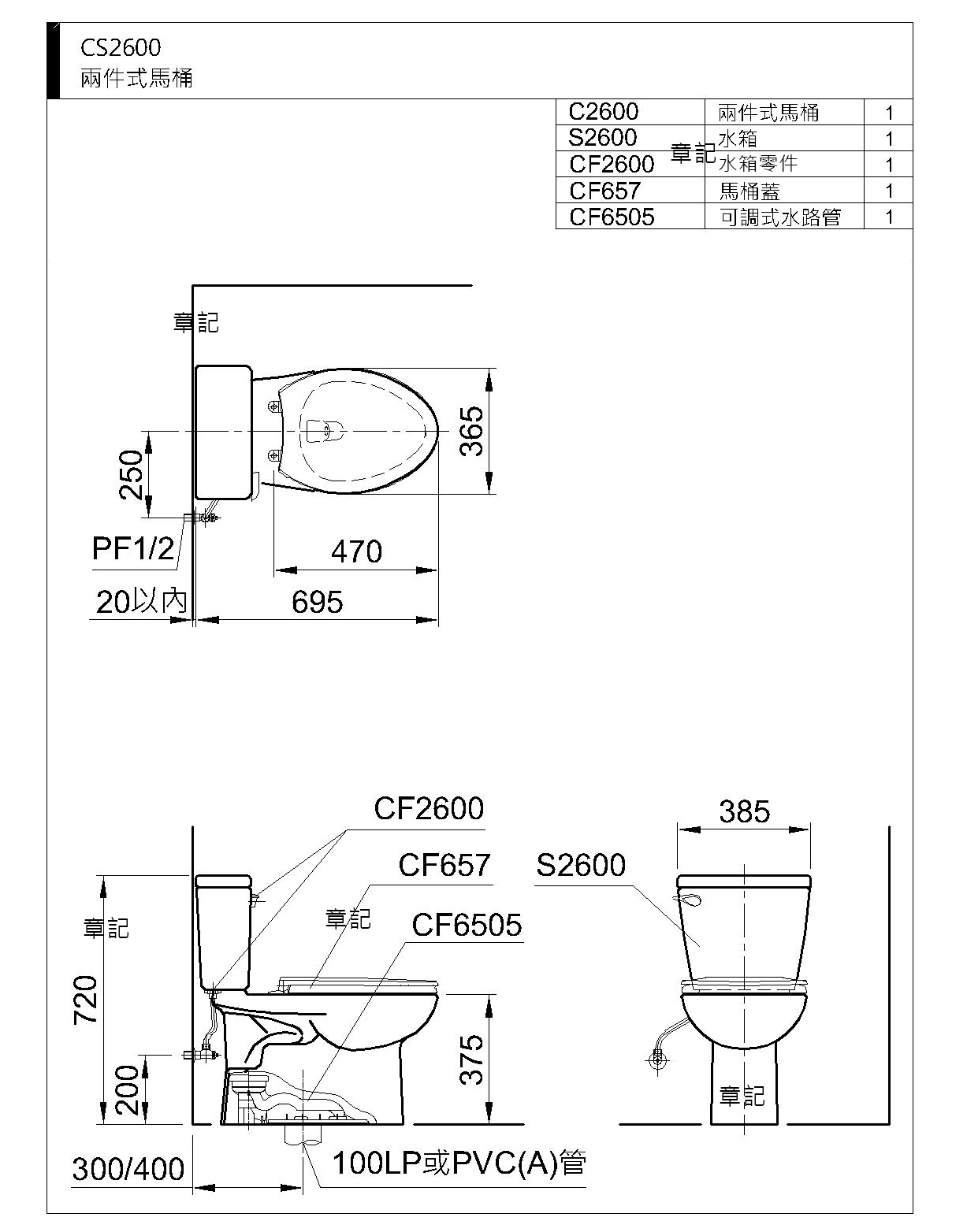 和成牌(HCG)兩件式馬桶馬桶 CS2600AdbT 尺寸圖