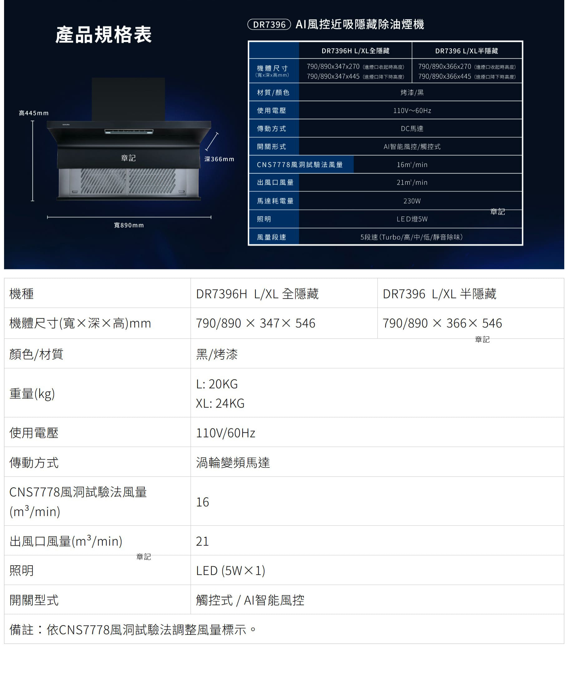 櫻花牌(SAKURA)渦輪變頻 AI風控半隱藏除油煙機(80/90cm) DR7396L_DR7396XL