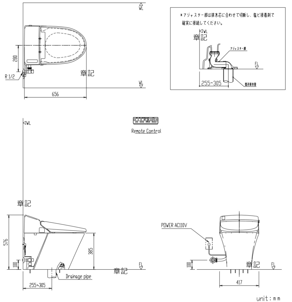 INAX SATIS J 全自動電腦馬桶 DV-J214G-VL-TW-BW1 尺寸圖