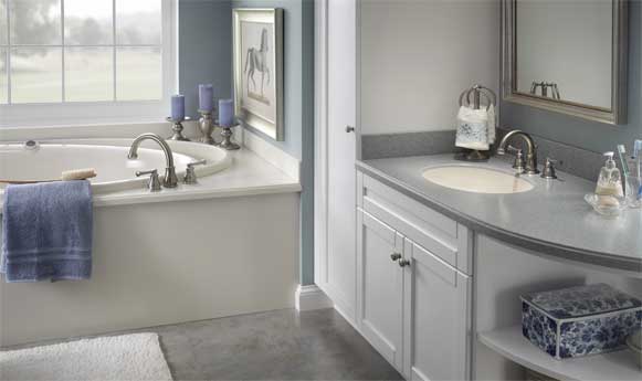 CORIAN®人造石,除了能使用於洗臉盆檯面(下圖右),也能和浴缸檯面(下圖左)完美搭配。