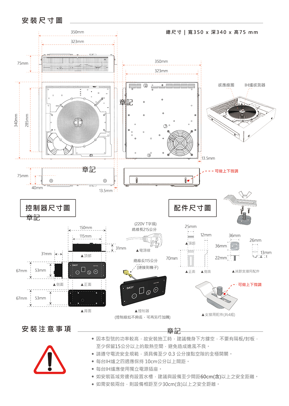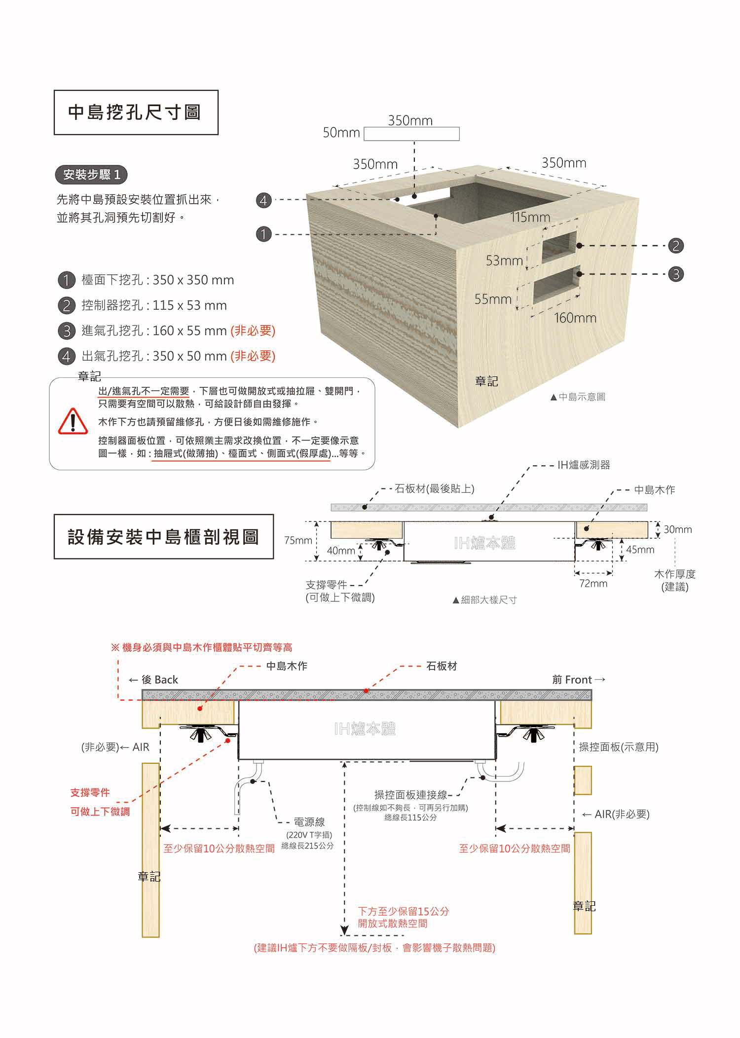 檯面下挖孔 : 350 x 350 mm (此尺寸有保留縫隙,如需緊密再與師父討論)控制器挖孔 : 115 x 53 mm (控制器面板位置,可依照業主需求改換位置,不一定要項示意圖一樣, 如 : 抽屜式、檯面式、側面式...等等。) 進氣孔挖孔 : 160 x 55 mm (非必要) 出氣孔挖孔 : 350 x 50 mm (非必要) (出/進氣孔不一定需要,下層也可做開放式或抽拉屜、雙開門,只需要有空間可以散熱,可給設計師自由發揮。) |