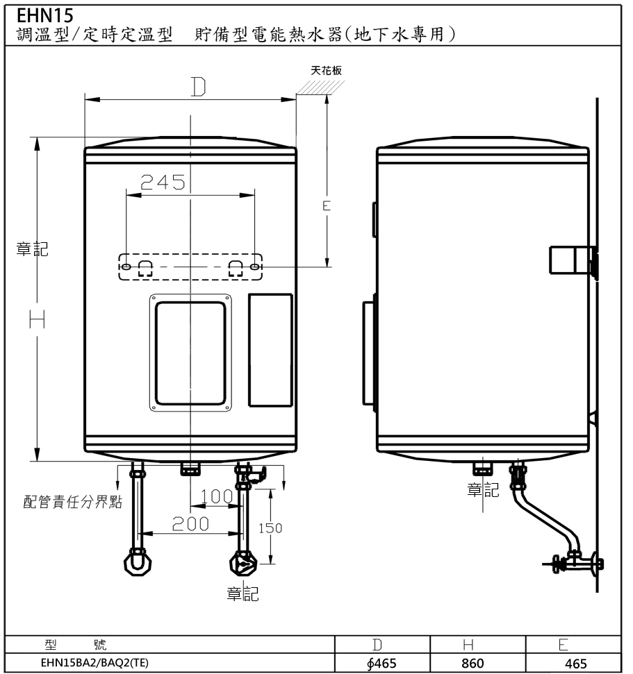 和成牌(HCG)壁掛式調溫型貯備型電能熱水器 EHN15BA2 尺寸圖