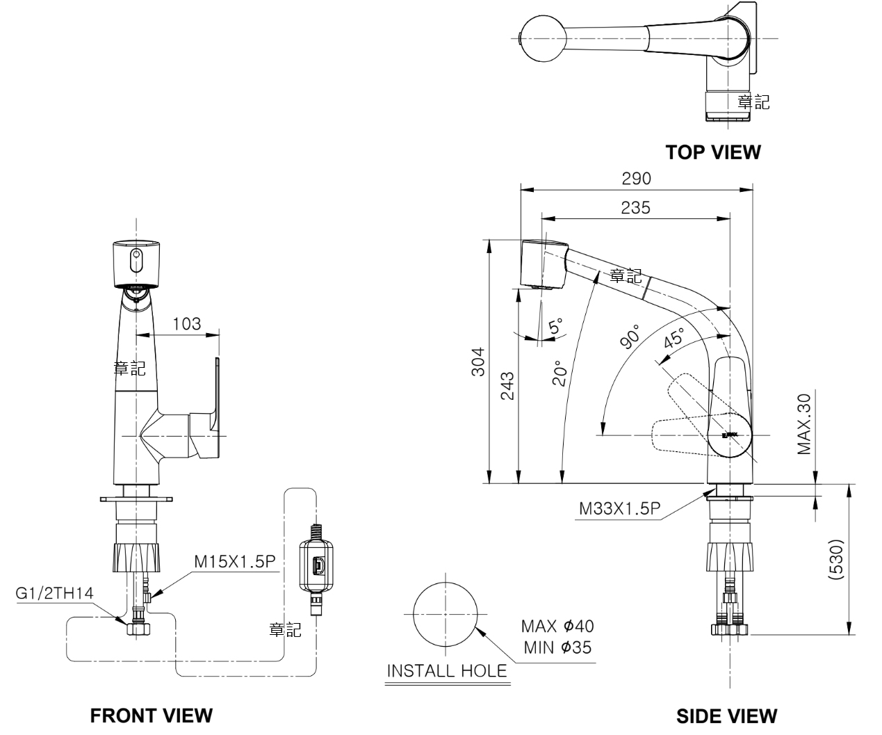 INAX 伸縮廚房龍頭 FD1864 尺寸圖