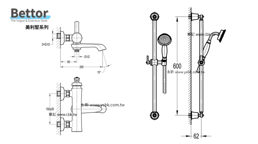BETTOR沐浴龍頭滑桿組(古銅色) FH7109-D100-ORB_FH9509-568-ORB 尺寸圖