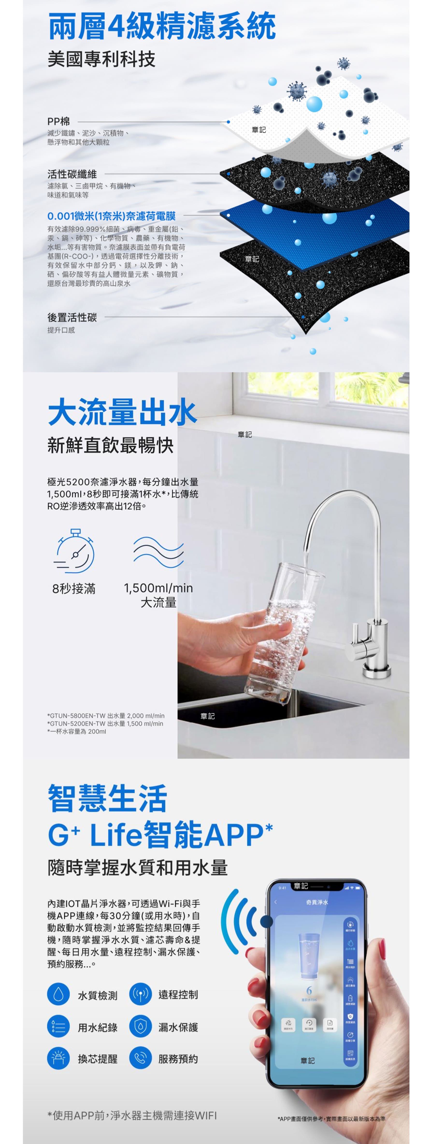 智能龍頭、304食品級不鏽鋼材質、智能濾心提醒。