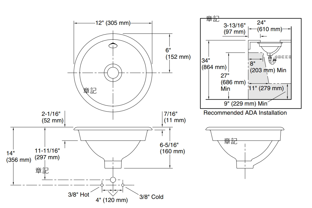 KOHLER Iron Plains 鑄鐵檯面盆(30cm) K-20211-7 尺寸圖