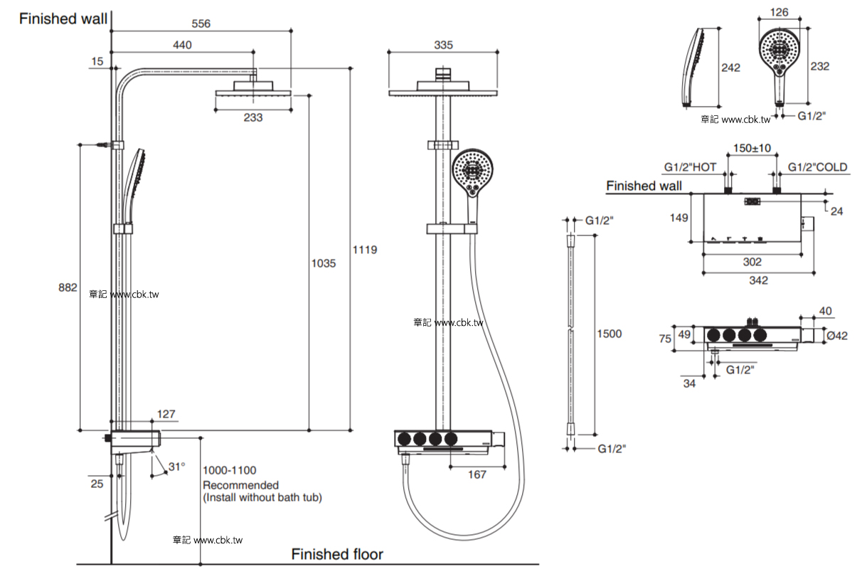 KOHLER Urbanity 定溫三路淋浴柱 K-23861T-9-CP 尺寸圖