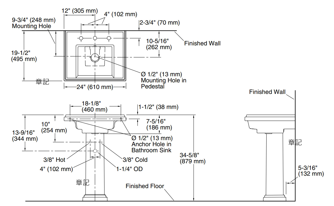 KOHLER Tresham 方形立柱式瓷腳面盆(61cm) K-2844-8-0 尺寸圖
