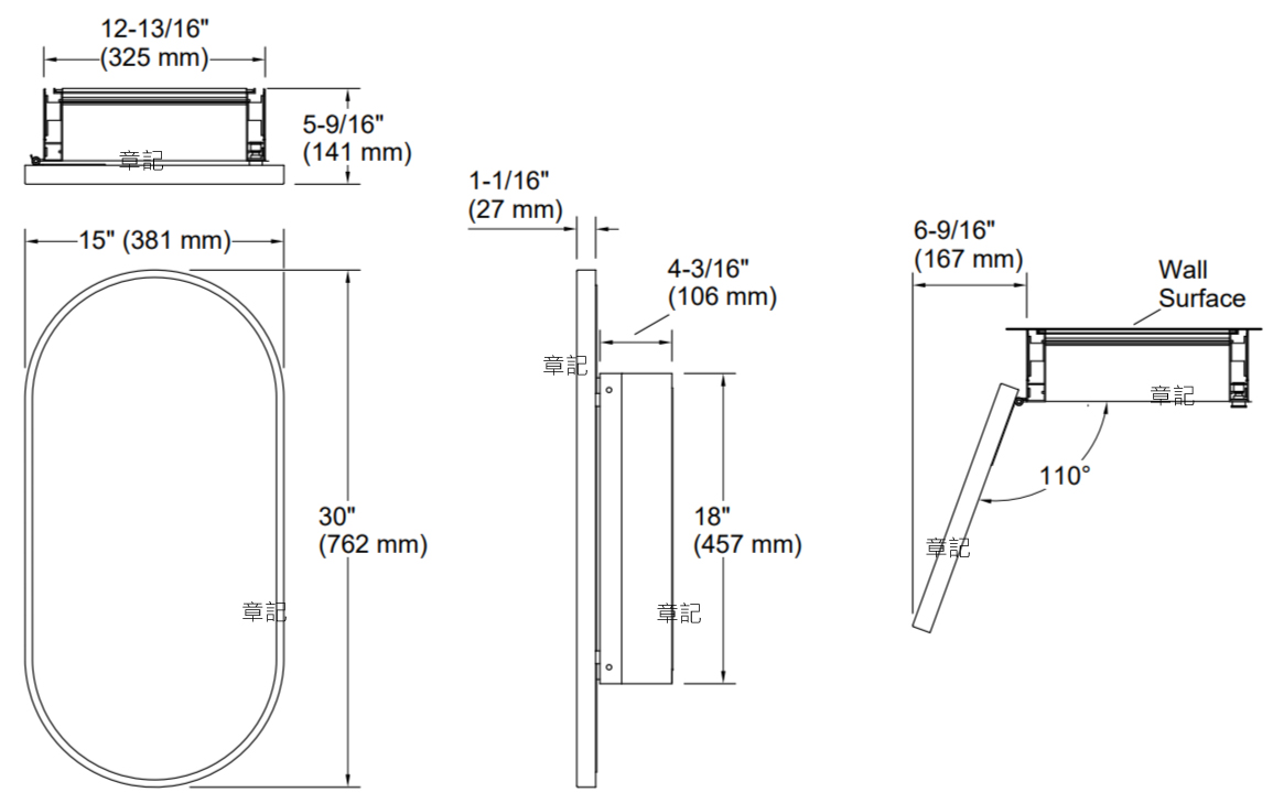 KOHLER Verdera 膠囊形鏡櫃 K-35573-BLL 尺寸圖