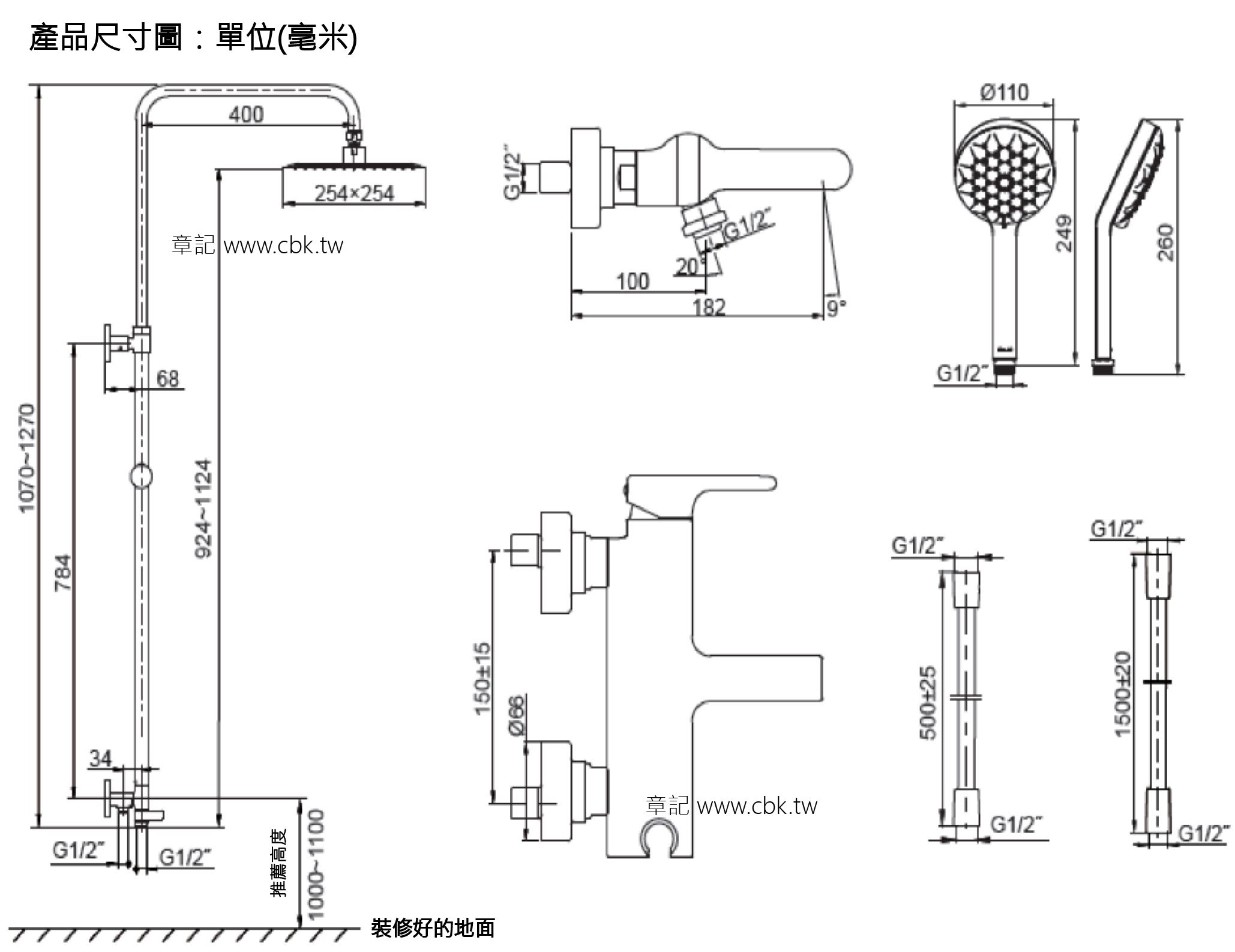 KOHLER Singulier 淋浴柱 K-72672T-D4-CP 尺寸圖