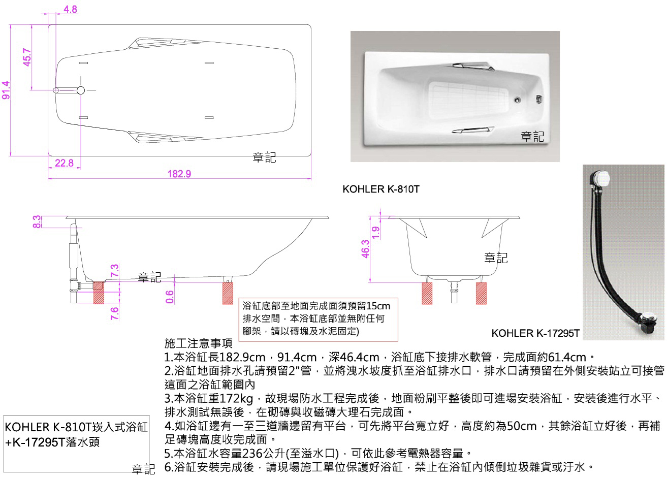 KOHLER Caribbean 嵌入式鑄鐵浴缸(180cm) K-810T-0 尺寸圖