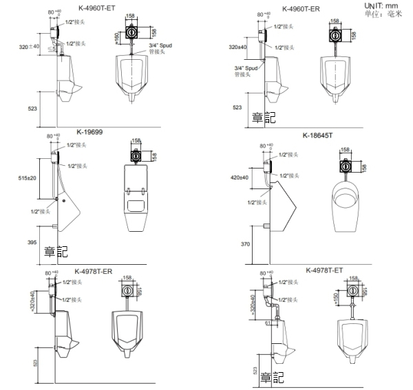 下圖:本產品與各式KOHLER小便斗搭配安裝規格