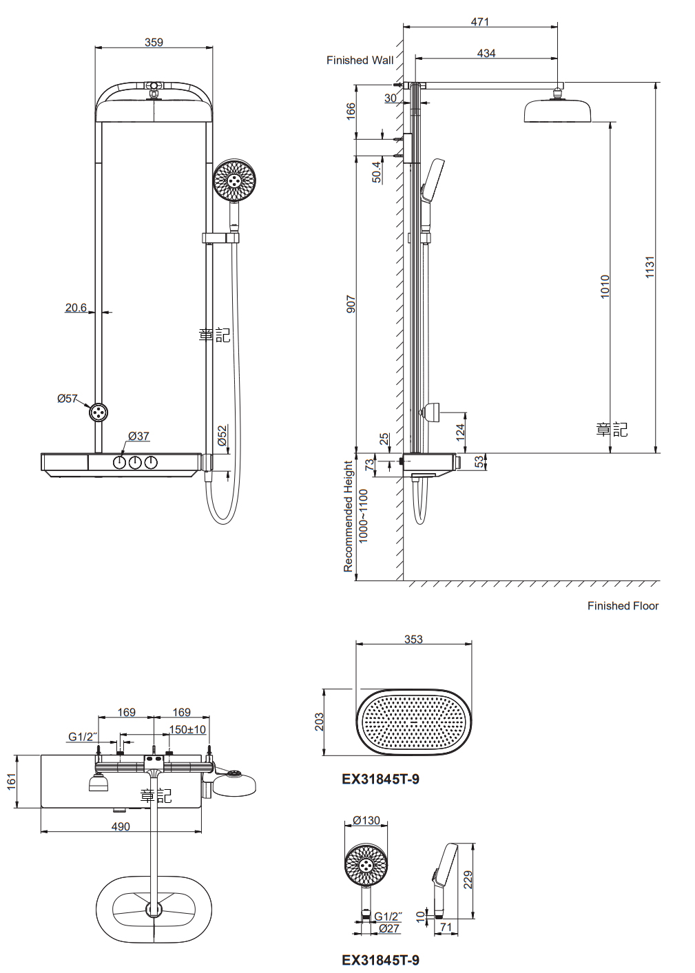 KOHLER Spaviva 恆溫三路淋浴柱(霧黑) K-EX31845T-9-BL 尺寸圖